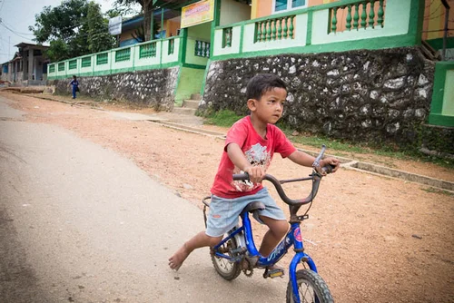 The little boy enjoying the thrill of coasting down the slope on his chainless bike. Batam, 2012