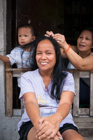 The woman smiles as her hair are being played with. In this impoverished community, people live densely together and households consist of many members. 2011